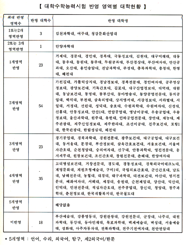¶Ç Ç¥ÁØÁ¡¼ö¸¦ Ȱ¿ëÇÏ´Â ´ëÇÐÀÌ 55°÷, ¹éºÐÀ§·Î ÀüÇüÇÏ´Â ´ëÇÐÀÌ 83°÷, ¼ö´É Á¡¼ö¸¦ Ȱ¿ëÇÏÁö ¾Ê´Â ´ëÇеµ ¼¿ï¿¹¼ú´ëÇÐ µî 19°³±³ÀÌ´Ù.