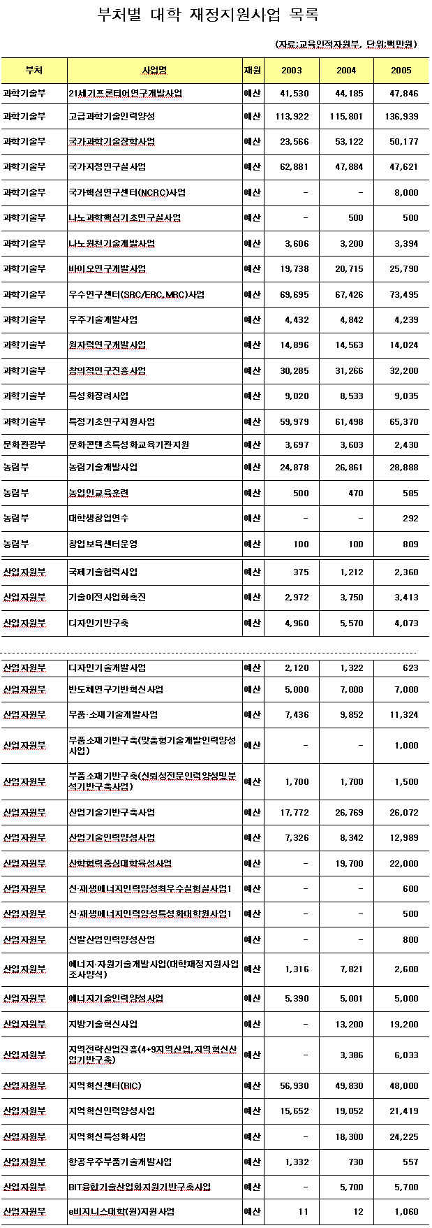 [Ç¥]ºÎóº° ´ëÇÐ ÀçÁ¤Áö¿ø»ç¾÷ ¸ñ·Ï ¹× ¿¹»ê(°ú±âºÎ~»êÀÚºÎ)