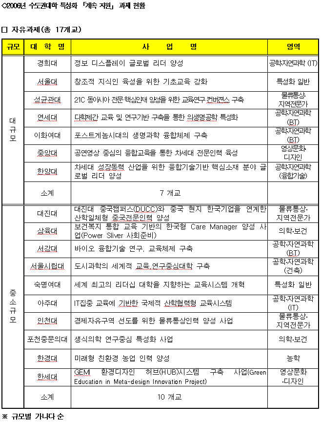 Áö³ÇØ ¼öµµ±Ç´ëÇРƯ¼ºÈ Áö¿ø»ç¾÷¿¡ ¼±Á¤µÅ 2008³â±îÁö 4³â µ¿¾È Áö¿ø¹Þ´Â ´ëÇÐÀº ¸ðµÎ 19°³ ´ëÇÐ 28°³ »ç¾÷´ÜÀÌ´Ù. ÀÌ Áß ÀÚÀ¯°úÁ¦´Â 17°³ »ç¾÷´ÜÀ¸·Î ÃÑ 319¾ï¿øÀÌ Áö¿øµÈ´Ù.