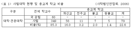 ½ÇÁ¦·Î ÇØ¹æ ÈÄ 21°³±³¿¡ ºÒ°úÇÏ´ø ±¹³» °íµî±³À°±â°ü(´ëÇÐ, Àü¹®´ëÇÐ, ±â¼ú´ëÇÐ Æ÷ÇÔ)Àº 2006³â ÇöÀç 4¹é9°³·Î ¹«·Á 20¹è °¡±îÀÌ Áõ°¡ÇßÀ¸¸ç, ÀÌ °¡¿îµ¥ »ç¸³Çб³°¡ 3¹é49·Î Àüü °íµî±³À°±â°üÀÇ 85%¸¦ Â÷ÁöÇϰí ÀÖ´Ù. Á¾±³°è Çб³´Â °³½Å±³ 56°³, õÁÖ±³ 11°³, ºÒ±³ 7°³, ¿øºÒ±³ 5°³ µî 79°³·Î Àüü »çÇÐÀÇ 22. 6%¸¦ ³ªÅ¸³½´Ù. ÀÌó·³ Á¾±³°è »çÇÐÀÌ Â÷ÁöÇÏ´Â ºñÁßÀÌ ³ôÀº °Íµµ ¿ì¸®³ª¶ó »çÇÐÀÇ Æ¯Â¡ Áß ÇϳªÀÌ´Ù.