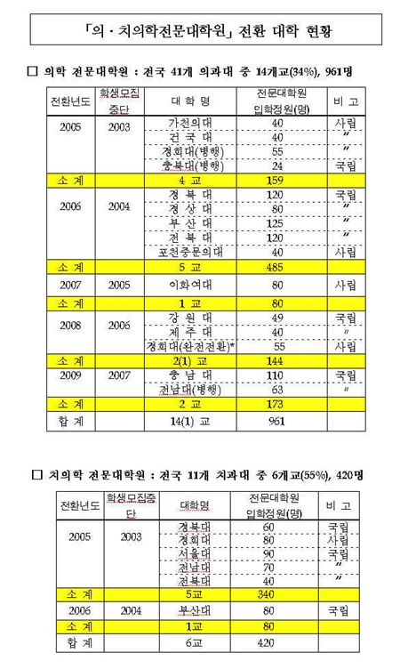 ÀÌ¿¡ µû¶ó 2009Çг⵵±îÁö Àüü 41°³ Àǰú´ë Áß ¾à 34%ÀÎ 14°³´Â ¡®4(ÇкÎ)+4(´ëÇпø)¡¯ÀÇ Àü¹®´ëÇпøÀ¸·Î ¹Ù²î´Â ¹Ý¸é ³ª¸ÓÁö´Â ¡®2(¿¹°ú)+4(º»°ú)¡¯ÀÇ Àǰú´ë¸¦ À¯ÁöÇÏ°Ô µÆ´Ù. Ä¡Àǰú´ëÇÐÀº Àüü 11°³ Áß Àý¹ÝÀÌ ³Ñ´Â 6°³°¡ Àü¹®´ëÇпøÀ¸·Î ÀüȯÇÒ ¿¹Á¤ÀÌ´Ù.