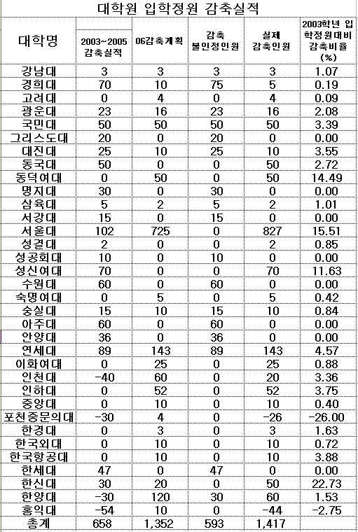 2006Çг⵵ ´ëÇпø ÀÔÇÐÁ¤¿øÀº ¼¿ï´ë°¡ 7¹é25¸í °¨Ãà°èȹÀ» ¹àÈù °ÍÀ» ºñ·ÔÇØ ÇѾç´ë 90¸í, ÀÎõ´ë 60¸í, ¿¬¼¼´ë 54¸í, ÀÎÇÏ´ë 52¸í, µ¿´ö¿©´ë 50¸í, ÀÌÈ¿©´ë 25¸í, ÇѽŴë 20¸í, Á߾Ӵ롤Çѱ¹¿Ü´ë °¢ 10¸í µîÀ» ÁÙÀÏ ¿¹Á¤ÀÌ´Ù.