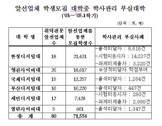ƯÈ÷ Çлý ¸ðÁýÀÌ ¾î·ÆÀÚ ÇѼºµðÁöÅдë, ¿µÁø»çÀ̹ö´ë, ±¹Á¦µðÁöÅдë, ºÎ»êµðÁöÅдë, ¼¼¹ÎµðÁöÅдë, ¿¸°»çÀ̹ö´ë µî 6°÷ÀÌ ¾Ë¼± ¾÷ü¸¦ ÅëÇØ Çлý 7¸¸1õ5¹é54¸íÀ» ¸ðÁýÇÑ ÈÄ Ãâ°á °ü¸®µµ Á¦´ë·Î ÇÏÁö ¾ÊÀºÃ¤ ÇÐÁ¡À» ºÎ¿©ÇÑ »ç½ÇÀÌ È®ÀεƴÙ.