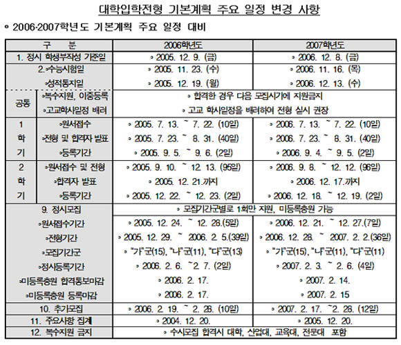 ±³À°ÀÎÀûÀÚ¿øºÎ´Â 29ÀÏ À̰°Àº ³»¿ëÀÇ '2007Çг⵵ ´ëÀÔÀüÇü ±âº»°èȹ'À» È®Á¤ ¹ßÇ¥Çϰí Áö³ÇØ¿Í ¸¶Âù°¡Áö·Î ¼ö½Ã 1Çб⠸ðÁý½Ã±â¸¦ 2006³â 7¿ù 13ÀϺÎÅÍ ½Ç½ÃÇÑ´Ù°í ¹àÇû´Ù. <Ç¥ ÂüÁ¶>