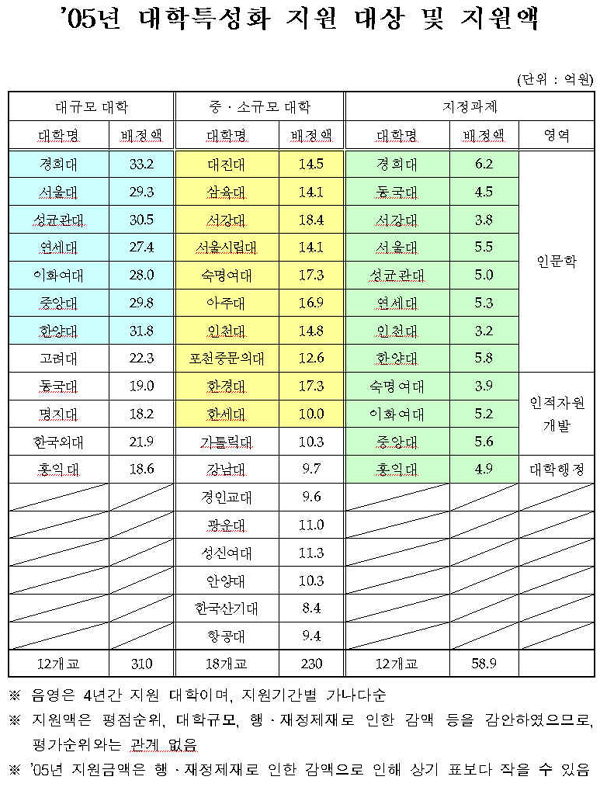 ´õ¿íÀÌ À̹ø¿¡ ¼±Á¤µÈ ´ëÇеéÀº Æò°¡Á¡¼ö¿¡ µû¶ó ¿À´Â 2008³â±îÁö 4³â°£ ÁýÁß Áö¿øÀ» ¹ÞÀ» ¼ö ÀÖ¾î ´ëÇа£ ÆÇµµ º¯È¿¡ ±ÍÃß°¡ ¸ð¾ÆÁ³´Ù.