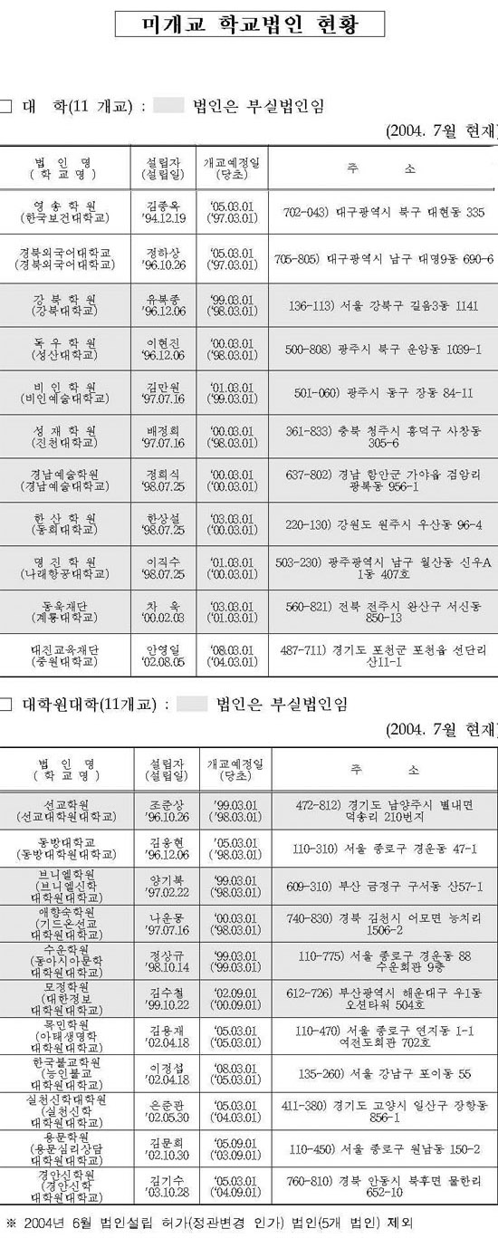 ±³À°ºÎ »çÇÐÁ¤Ã¥°ú ÀÌ»ó¿¬ »ç¹«°üÀº ¡°¹ýÀθ¸ ¼³¸³ÇÏ°í ¼ö³âµ¿¾È ´ëÇÐÀ» ¼³¸³ÇÏÁö ¾Ê°í ±³¼ö ä¿ëÀ̳ª ¶¥ »ç±â µî »çȸÀû ¹°ÀǸ¦ ºú¾î¿Â ¹Ì°³±³ ¹ýÀεéÀ» Á¤¸®ÇÑ °Í¡±À̶ó¸ç ¡°´ëÇÐ ¼³¸³¿ä°ÇÀ» °ÈÇØ ¾ÕÀ¸·Î ¹Ì°³±³ ¹ýÀο¡ ´ëÇØ¼´Â ÇÊ¿äÇÑ Á¶Ä¡¸¦ ÃëÇÒ °Í"À̶ó°í ¸»Çß´Ù.