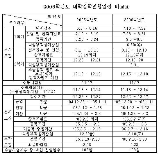 ÀÌ¿¡ µû¶ó ¼ö½Ã 1Çб⠿ø¼Á¢¼ö ±â°£Àº ¿ÃÇØ 14Àϰ£¿¡¼ 2006Çг⵵¿¡´Â 10Àϰ£À¸·Î ÁÙ°í ¼ö½Ã 2Çб⠿ø¼Á¢¼ö ½ÃÀÛ ³¯Â¥µµ 9¿ù10ÀÏ·Î ¿ÃÇØ(9¿ù1ÀÏ)º¸´Ù 9ÀÏ ´ÊÃçÁ³°í, Á¤½Ã¸ðÁý ÇлýºÎ ÀÛ¼º ±âÁØÀϵµ 12¿ù10ÀÏ·Î ¿ÃÇØº¸´Ù ÀÏÁÖÀÏ ´ÊÃçÁ³´Ù.