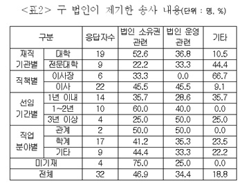 ±¸ ¹ýÀÎÃø ÀλçµéÀÇ ¼Û»ç Á¦±â ¿©ºÎ¸¦ ¹¯´Â Áú¹®¿¡´Â Àý¹Ý °¡·®(49.2%)ÀÌ ¡®±×·¸´Ù¡¯°í ´äÇߴµ¥, ¼Û»ç ³»¿ëÀº ¹ýÀÎ ¼ÒÀ¯±Ç °ü·Ã »çÇ×(46.9%)ÀÌ ÀϼøÀ§·Î, ¹ýÀο(34.4%)ÀÌ µÚ¸¦ µû¶ú´Ù. ¼Û»ç¸¦ ´çÇÑ °æÇèÀº ´ëÇÐ(52.6%)ÀÌ Àü¹®´ëÇÐ(22.2%)º¸´Ù µÎ¹è¸¦ ³Ñ¾ú´Ù. <Ç¥2 ÂüÁ¶>