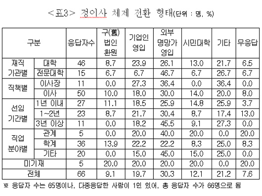 Á¤ÀÌ»ç üÁ¦·Î ÀüȯÇÒ °æ¿ì ¿ÜºÎ ¸í¸Á°¡ ¿µÀÔ(30.3%)À» °¡Àå ¼±È£Çß°í, ¡®Çб³½ÇÁ¤ ¹× ±¸¼º¿øµéÀÇ Àǰ߿¡ µû¶ó °áÁ¤¡¯ µî ±âŸ ´äº¯ÀÌ 21.2%, ±â¾÷ÀÎ ¿µÀÔ 19.7%, ½Ã¹Î´ëÇÐ 12.1% µîÀÇ ¼øÀ¸·Î, ±¸¹ýÀο¡ ȯ¿øÇÏ´Â °Ô ¹Ù¶÷Á÷ÇÏ´Ù´Â Àǰß(9.1%)ÀÌ °¡Àå ³·¾Ò´Ù. <Ç¥3 ÂüÁ¶>