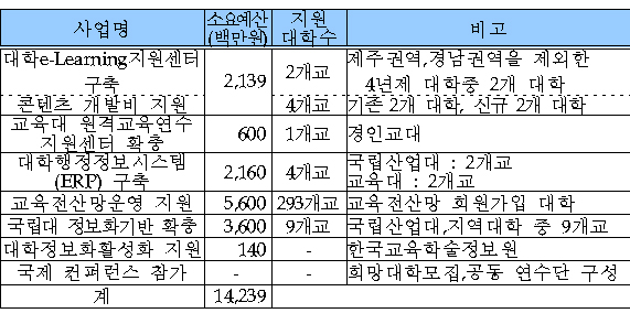 ±³À°ÀÎÀûÀÚ¿øºÎ´Â ´ëÇÐÁ¤º¸È¸¦ À§ÇØ ¿ÃÇØ 1¹é42¾ïÀÇ ¿¹»êÀ» ÅõÀÔ, ¡âe-·¯´× Áö¿ø¼¾ÅÍ ¼³Ä¡ ¡âÇàÁ¤Á¤º¸½Ã½ºÅÛ ±¸Ãà ¡â±³À°Àü»ê¸Á ¿î¿µ Áö¿ø ¡â±¹¸³´ë Á¤º¸È±â¹Ý È®Ãæ µîÀÇ »ç¾÷À» ÆîÄ£´Ù°í ¹àÇû´Ù.<Ç¥ ÂüÁ¶>