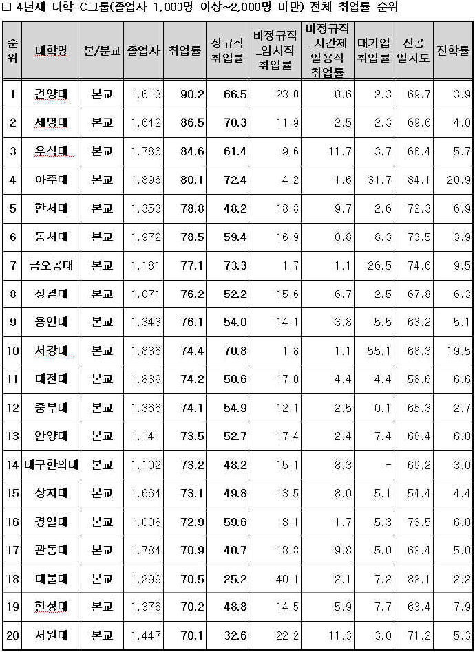 [Ç¥]4³âÁ¦ ´ëÇÐ Àüü Ãë¾÷·ü ¼øÀ§(Á¹¾÷»ý 1,000~2,000¸í)