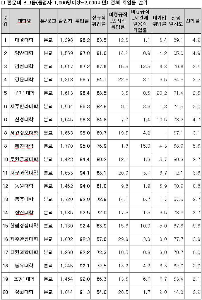 Àü¹®´ë Àüü Ãë¾÷·ü ¼øÀ§(Á¹¾÷»ý 1,000¸í ÀÌ»ó 2,000¸í ¹Ì¸¸)