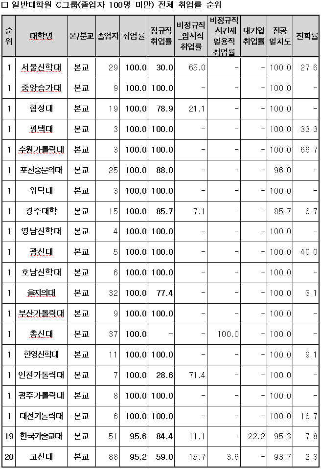 ÀϹݴëÇпø Àüü Ãë¾÷·ü ¼øÀ§(Á¹¾÷»ý 100¸í ¹Ì¸¸)
