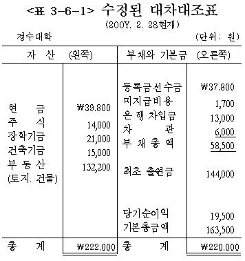 <Ç¥ 3-6-1>°ú °°ÀÌ ¼öÁ¤µÈ ´ëÂ÷´ëÁ¶Ç¥¿¡ µû¸£¸é, 200y³â 2¿ù 28ÀÏ ÇöÀç, Á¤¼ö´ëÇÐÀÇ Àç»ê ÃѾ×Àº £Ü222,000. °±¾Æ¾ß ÇÒ ºÎä´Â µî·Ï±Ý¼±¼ö±Ý £Ü37,800°ú ÀºÇàÂ÷ÀÔ±Ý £Ü13,000 µî ÃÑ £Ü58,500¿øÀÌ´Ù. ÀÚ»ê ÃѾ׿¡¼ ºÎ並 Â÷°¨ÇÑ ³ª¸ÓÁö´Â £Ü163,500À¸·Î, ÀÌ´Â ´ëÇÐ ¼³¸³½Ã ¼³¸³ÀÚ°¡ Ã⿬ÇÑ ±Ý¾× £Ü144,400°ú ´ç±â ¼øÀÌÀÍ £Ü69,500À» ÇÕÇÑ °ÍÀÌ´Ù.