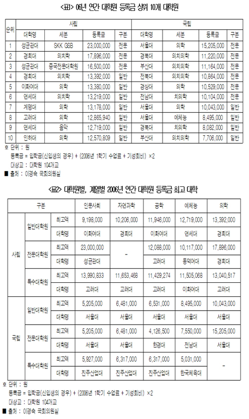 ±¹È¸ ±³À°À§¿øÈ¸ ¼Ò¼Ó À̰æ¼÷ ¿¸°¿ì¸®´ç ÀÇ¿øÀÌ ´ëÇк°·Î Á¦Ãâ¹ÞÀº Áö³ 2004³âºÎÅÍ ¿ÃÇØ±îÁö ÃÖ±Ù 3³â°£ ´ëÇпø µî·Ï±Ý ÇöȲÀ» ºÐ¼®ÇÑ °á°ú¿¡ µû¸£¸é °æÈñ´ë ÀÇÇÐÀü¹®´ëÇпø 4³â °úÁ¤¿¡ µå´Â ¼ø¼ö Çкñ¸¸ 7,000¸¸¿ø, ¼º±Õ°ü´ë Àι®»çȸ°è¿ SKK GSB(graduate school of business)°úÁ¤ ¼ö·á¿¡´Â 4,600¸¸¿øÀÌ ÇÊ¿äÇÏ´Ù.