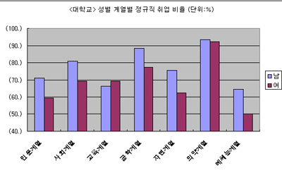 ¼ºº°·Î º¸¸é, Á¤±ÔÁ÷ Ãë¾÷·üÀÌ Àü¹®´ëÇÐÀº ³²¼º 78.7%, ¿©¼º 77.4%·Î °ÅÀÇ Â÷À̰¡ ¾ø¾úÀ¸³ª, 4³âÁ¦ ´ëÇÐÀº ³²¼º 81.9%, ¿©¼º 66.6%·Î °ÝÂ÷¸¦ º¸¿´´Ù. 4³âÁ¦ ¿©¼º Á¤±ÔÁ÷ Ãë¾÷·üÀº Àü¹®´ëÇÐ ¿©¼º Ãë¾÷·ü º¸´Ùµµ 10.8%Æ÷ÀÎÆ®°¡ ³·¾Ò´Ù.