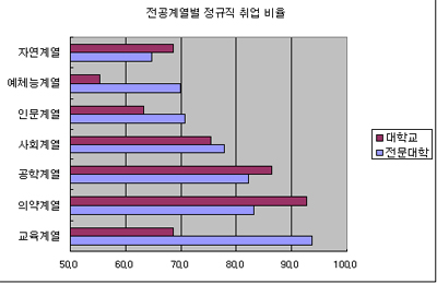 ÀǾà°è¿ÀÇ °æ¿ì Àü¹®´ëÇÐ 83.3%, 4³âÁ¦ ´ëÇÐ 92.8%¿´°í ±³À°°è¿Àº Àü¹®´ëÇÐ 93.7%, 4³âÁ¦ ´ëÇÐ 68.6%¿´´Ù. Àü¹®´ëÇÐÀÇ °æ¿ì À¯¾Æ±³À°°ú Á¹¾÷»ýµéÀÌ Á¤±ÔÁ÷ À¯Ä¡¿ø ±³»ç·Î ÁøÃâÇÑ ¹Ý¸é 4³âÁ¦ ´ëÇÐÀº Áß¡¤°í±³ ±³»ç·Î ÁøÃâÇÏÁö ¸øÇÑ Á¹¾÷ÀÚ°¡ ºñÁ¤±ÔÁ÷ Çпø °»ç·Î ¸¹ÀÌ ÁøÃâÇ߱⠶§¹®À¸·Î Ç®À̵ȴÙ.