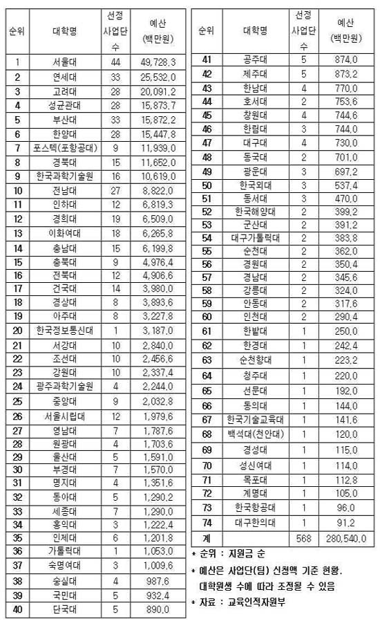 ƯÈ÷ ¼º±Õ°ü´ë´Â °úÇбâ¼ú, Àι®»çȸ, Àü¹®¼ºñ½º ºÐ¾ß µî ´ëÇü »ç¾÷´Ü¿¡ Áö¿øÇÑ 20°³ »ç¾÷´ÜÀÌ ¸ðµÎ ¼±Á¤µÇ´Â ±â¿°À» ÅäÇß´Ù. Æ÷½ºÅØ(Æ÷Ç×°ø´ë)Àº 8°³ »ç¾÷´ÜÀÌ ¼±Á¤µÅ 45¾ï¿øÀÌ ´Ã¾î³ 1¹é17¾ï¿øÀ» Áö¿ø¹Þ¾Ò´Ù.