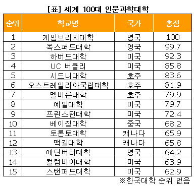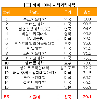 ¼¿ï´ë´Â Àι®°úÇÐ Æò°¡¿¡¼ Áö³ÇØ 51À§¸¦ ±â·ÏÇßÁö¸¸ ¿ÃÇØ Æò°¡¿¡¼´Â ¼øÀ§±Ç ¹ÛÀ¸·Î ¹Ð·Á³µ´Ù. »çȸ°úÇÐ Æò°¡¿¡¼ ¼¿ï´ë°¡ 56À§·Î »õ·Ó°Ô ¼øÀ§±Ç¿¡ ÁøÀÔÇÑ ¹Ý¸é, °í·Á´ë´Â ¼øÀ§±Ç ¹ÛÀ¸·Î ¹Ð·È´Ù. °í·Á´ë´Â Áö³ÇØ »çȸ°úÇÐ Æò°¡¿¡¼ 66À§¸¦ ±â·ÏÇß´Ù.