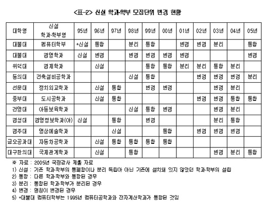 ½ÅÀÔ»ý À¯Ä¡¸¦ À§ÇØ ÇаúÀÇ °£ÆÇÀ» ¹Ù²ã´Ù´Â °æ¿ìµµ ¼ÓÃâÇϰí ÀÖ´Ù. ´ëºÒ´ë ÄÄÇ»ÅÍÇкδ 95³â ¼³¸³ ÀÌÈÄ 7Â÷·Ê³ª ¸ðÁý´ÜÀ§¿Í ¸íĪÀÌ ¹Ù²î¾úÀ¸¸ç À§´ö´ë °æÁ¦Çаú´Â 6Â÷·Ê, µ¿ÀÇ´ë °ÇÃ༳ºñ°øÇаú, ¼±¹®´ë Á¤Ä¡¿Ü±³Çаú, ÁßºÎ´ë µµ½Ã°øÇаúµµ 5¹ø ÀÌ»ó º¯°æµÆ´Ù. <Ç¥2 ÂüÁ¶>