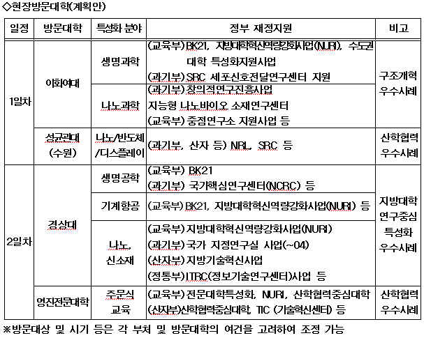 ±¸Á¶°³Çõ ¼º°ú¿¡ µû¸¥ Àμ¾Æ¼ºê µîÀ» ºÎóº° ´ëÇÐÁö¿ø»ç¾÷¿¡ È®´ë Àû¿ëÇÏ´Â ¹æ¾Èµµ ³íÀǵƴÙ. ±³À°ºÎ ³»¿¡¼´Â 2´Ü°è BK21»ç¾÷°ú ¼öµµ±Ç´ëÇРƯ¼ºÈÁö¿ø»ç¾÷¿¡ ÀÌ¹Ì ¹Ý¿µµÆ°í ÇöÀç Æò°¡ÁöħÀ» ¸¶·Ã ÁßÀÎ ´©¸®»ç¾÷¿¡µµ ¹Ý¿µÇÒ ¿¹Á¤ÀÌ´Ù. ¶ÇÇÑ »êÀÚºÎÀÇ Áö¿ªÇõ½Å¼¾ÅÍ(RIC), °ú±âºÎÀÇ ±¹°¡Çٽɿ¬±¸¼¾ÅÍ(NORC) µî ´Ù¸¥ ºÎó·Î È®´ëÇØ ³ª°£´Ù´Â °èȹÀÌ´Ù. ÇмúÁøÈïÀç´ÜÀ̳ª °úÇÐÀç´Ü µîÀÇ ¼Ò±Ô¸ð ÇÁ·Î±×·¥¿¡´Â Àû¿ëÇÏÁö ¾Ê´Â´Ù.