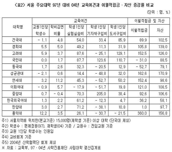 È«ÀÍ´ë°¡ 1997³â ´ëºñ 2004³â 12.2¸í ´Ã¾î³ °ÍÀ¸·Î ³ªÅ¸³ª ÀüÀÓ±³¿ø 1Àδç Çлý ¼ö°¡ °¡Àå Å©°Ô ¾ÇȵƴÙ. °í·Á´ë 5.9¸í, °æÈñ´ë 5.5¸í, ¿¬¼¼´ë 3.2¸í, ÇѾç´ë 3,0¸í µîÀÇ ¼øÀ¸·Î ±³À° ¿©°ÇÀº ´õ ³ªºüÁø °ÍÀ¸·Î µå·¯³µ´Ù.