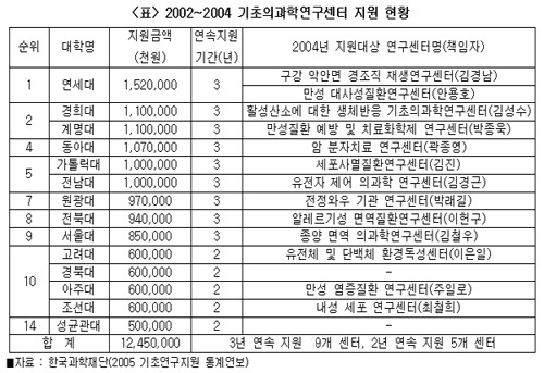 º»Áö°¡ Çѱ¹°úÇÐÀç´ÜÀÇ 2005 ±âÃÊ¿¬±¸Áö¿ø Åë°è¿¬º¸¸¦ ºÐ¼®ÇÑ °á°ú ±âÃʰúÇבּ¸»ç¾÷ °¡¿îµ¥ ¿ì¼ö¿¬±¸¼¾ÅÍÀ°¼º»ç¾÷ Áß ±âÃÊÀǰúÇבּ¸¼¾ÅÍ(MRC)¿¡ ´ëÇÑ Áö¿ø¿¡¼ 2002³âºÎÅÍ 2004³â±îÁö ÃÖ±Ù 3³â°£ °¡Àå ¸¹Àº Áö¿øÀ» ¹ÞÀº ´ëÇÐÀº ¿¬¼¼´ëÀÎ °ÍÀ¸·Î ³ªÅ¸³µ´Ù.