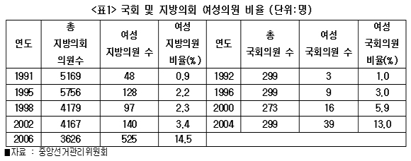 Áß¾Ó¼±°Å°ü¸®À§¿øÈ¸ ±¹È¸ÀÇ¿ø¼±°ÅÃѶ÷, Áö¹æÀÇȸÀÇ¿ø¼±°ÅÃѶ÷¿¡ µû¸£¸é Áö³ 1991³â ÃÑ Áö¹æÀÇȸ ÀÇ¿ø 5,169¸í Áß ¿©¼ºÀÇ¿øÀÇ ¼ö´Â 48¸í¿¡ ºÒ°úÇß´Ù. ä 1%°¡ µÇÁö ¸øÇß´Ù. 1992³â ±¹È¸ÀÇ¿ø Áß ¿©¼ºÀÇ¿øÀÇ ºñÀ²µµ 299¸í Áß 3¸íÀ¸·Î 1.0%¿¡ Áö³ªÁö ¾Ê¾Ò´Ù.
