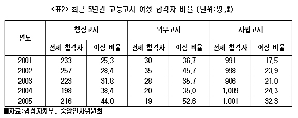 »ç¹ý½ÃÇèÀÇ °æ¿ìµµ ¿Ü¹«°í½Ã³ª ÇàÁ¤°í½Ã¿¡ ºñÇØ Áõ°¡¼¼°¡ ´Ù¼Ò µÐÇϱâ´Â ÇÏÁö¸¸ ¿©¼º ÇÕ°ÝÀÚ ºñÀ²ÀÌ Áö³ÇØ 32.3%·Î óÀ½À¸·Î 30%¸¦ ³Ñ¾î¼¹´Ù. 4³âÀüÀÎ 2001³â¸¸ ÇØµµ »ç½ÃÇÕ°ÝÀÚ Áß ¿©¼ºÀÇ ºñÀ²Àº 17.5%¿¡ ºÒ°úÇß´Ù.