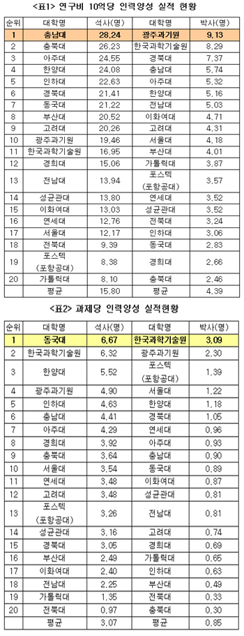 µ¿±¹´ë´Â °úÁ¦´ç ¼®»ç 6.67¸íÀ» ¹èÃâÇØ °¡Àå ½ÇÀûÀÌ ¿ì¼öÇß°í Çѱ¹°úÇбâ¼ú¿øÀÌ 6.32¸íÀ¸·Î ±× µÚ¸¦ À̾ú´Ù. °úÁ¦´ç ¼®»ç±Þ ÀÎÀç Æò±Õ ¹èÃâÀοøÀÌ 3.07¸íÀε¥ ºñÇϸé ÀÌµé µÎ ±â°üÀº Æò±ÕÀÇ µÎ¹è¸¦ »óȸÇß´Ù. ÇѾç´ë°¡ 5.52¸í, ±¤ÁÖ°ú±â¿øÀÌ 4.90¸íÀ» ±â·ÏÇÏ¸ç ±× µÚ¸¦ À̾ú´Ù.