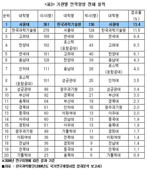 º»Áö°¡ Çѱ¹°úÇÐÀç´Ü ¡®2004³â ±¹°¡¿¬±¸°³¹ß»ç¾÷ ¼º°úºÐ¼® º¸°í¼¡¯¸¦ ºÐ¼®ÇÑ ¹Ù¿¡ µû¸£¸é °ú±âºÎ°¡ Áö¿øÇÏ´Â ±âÃʰúÇבּ¸»ç¾÷¿¡¼ ¿¬±¸ºñ 10¾ï´ç ÀÎÀç¾ç¼º ½ÇÀûÀÌ ³ôÀº ±â°üÀ¸·Î ¼®»ç´Â 28.24¸íÀ» ¹èÃâÇÑ Ãæ³²´ë, ¹Ú»ç´Â 9.13¸íÀ» ¹èÃâÇÑ ±¤ÁÖ°ú±â¿øÀÎ °ÍÀ¸·Î Áý°èµÆ´Ù.