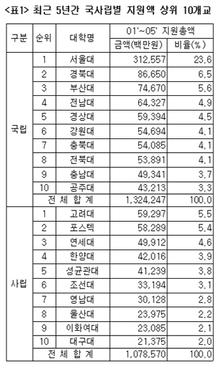 ±¹¸³´ëÀÇ °æ¿ì »óÀ§ 10°³ ´ëÇÐÀÌ Àüü ±¹¸³´ë ÀçÁ¤Áö¿ø¾×¿¡¼ Â÷ÁöÇÏ´Â ºñÀ²ÀÌ 2001³â 64.8%¿¡¼ 2005³â 68.8%·Î Áõ°¡Çß°í »ç¸³´ë ¿ª½Ã »óÀ§ 10°³ ´ëÇÐÀÌ »ç¸³´ë ÀçÁ¤Áö¿ø¾× °¡¿îµ¥ µ¿±â°£ 34.1%¿¡¼ 44.3%·Î 10.2% ºñÀ²ÀÌ ³ô¾ÆÁ³´Ù. ÀçÁ¤Áö¿ø µ¶Á¡Çö»óÀÌ ´õ ¶Ñ·ÇÇØÁø ¼ÀÀÌ´Ù.