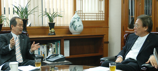 | ¡ã º»Áö ÀÌÀοø ȸÀå(¿À¸¥ÂÊ)°ú ´ë´ãÇϰí ÀÖ´Â Çã»ó¸¸ ÀÌ»çÀå./ÇÑ¸í¼· ±âÀÚ |