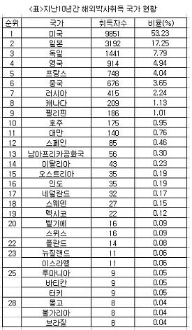 º»Áö°¡ Çѱ¹ÇмúÁøÈïÀç´Ü(ÀÌ»çÀå Çã»ó¸¸) ÇØ¿Ü¹Ú»çÇÐÀ§ÀÚ ÇöȲÀ» ºÐ¼®ÇÑ °á°ú¿¡ µû¸£¸é Áö³ 10³â°£ °¡Àå ¸¹Àº ÇØ¿Ü¹Ú»ç¸¦ ¹èÃâÇÑ ±¹°¡´Â ¹Ì±¹À¸·Î ¿©ÀüÈ÷ ¾ÐµµÀûÀÎ ºñÀ²À» ³ªÅ¸³Â´Ù.