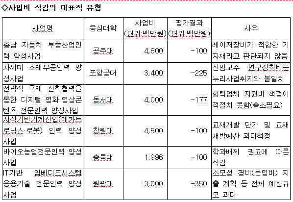 »ç¾÷ºñ »è°¨Àº »ç¾÷½ÇÀû°ú´Â º°µµ·Î »ç¾÷ºñ ÁýÇà°èȹÀ» ¹«¸®ÇÏ°Ô Á¦ÃâÇÑ »ç¾÷´ÜÀÌ ÁַΠöÅ𸦠¸ÂÀº °ÍÀ¸·Î ³ªÅ¸³µ´Ù. ´©¸®»ç¾÷Àº ±×µ¿¾È ´ëÇÐ ±¸Á¶°³Çõ ÃËÁø µîÀÇ ¼º°ú¿¡µµ ºÒ±¸Çϰí ÀϺΠ´ëÇеéÀÌ Á¤ºÎÀÇ Áö¿ø±ÝÀ» Ÿ³½ µÚ ¹æ¸¸ÇÏ°Ô »ç¿ëÇÏ´Â µîÀÇ ¹®Á¦Á¡ÀÌ ÁöÀûµÅ¿Ô´Ù.