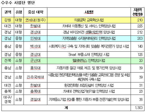 »è°¨ÇÑ »ç¾÷ºñÀÇ ¾à 17%¿¡ ÇØ´çÇÏ´Â 13¾ï¿øÀ» À¯Çüº° »óÀ§ 10%¿¡ ÇØ´çÇÏ´Â 12°³ »ç¾÷´Ü¿¡ Ãß°¡·Î Áö¿øÇϱâ·Î Çß´Ù. ÃÖ¿ì¼ö »ç¾÷´Ü¿¡´Â ¿¬¼¼´ë ÀÇ¡¤°øÇлç¾÷´ÜÀÌ »ÌÇû°í, ±º»ê´ë ÅÚ·¹¸Þƽ½º »ç¾÷´Ü°ú ÁøÁÖ±¹Á¦´ë ½Äǰ»ê¾÷´ÜÀº 2³â ¿¬¼Ó ¿ì¼ö»ç¾÷´ÜÀ¸·Î ¼±Á¤µÆ´Ù. Çѹç´ë¿Í °æ»ó´ë´Â °¢°¢ 2°³ »ç¾÷´ÜÀÌ ¿ì¼ö»ç¾÷´ÜÀ¸·Î ¼±Á¤µÇ´Â ¼º°ú¸¦ ÀÌ·ð´Ù.