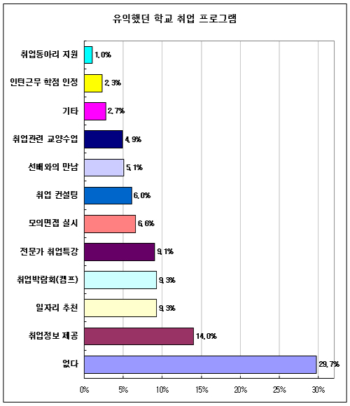 ±×³ª¸¶ µµ¿òÀÌ µÆ´Ù°í Æò°¡µÈ °ÍÀº 'Ãë¾÷Á¤º¸Á¦°ø'À¸·Î 14.6%°¡ À¯ÀÍÇß´Ù°í ´äÇßÁö¸¸ À¯ÀÍÇÑ ÇÁ·Î±×·¥ÀÌ ¾ø¾ú´Ù´Â ÀÀ´äÀÚÀÇ Àý¹Ý ¼öÁØ¿¡ ºÒ°úÇß´Ù.