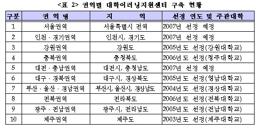 ´ëÇÐÀÌ·¯´×Áö¿ø¼¾ÅÍ´Â 2006³â ÇöÀç 7°³ ±Ç¿ª¿¡¼ ±¸Ãà․¿î¿µ Áß¿¡ ÀÖÀ¸¸ç, 3°³ ±Ç¿ªÀº 2007³â ¼±Á¤․±¸ÃàµÉ ¿¹Á¤ÀÌ´Ù. 10°³ ±Ç¿ªÀÇ ¼¾ÅͰ¡ ¸ðµÎ ±¸ÃàµÇ¸é ¼¾ÅͰ£ Ư¼ºÈ¸¦ ÅëÇÑ »óÈ£ ¿ªÇҺдã°ú º¸¿ÏÀÌ °¡´ÉÇϵµ·Ï ÇöÀç °¢ ¼¾ÅÍ¿¡¼ ÀÚüÀûÀ¸·Î °³¹ß, Á¦°øÁßÀÎ ÄÜÅÙÃ÷¸¦ Â÷º°È․Ư¼ºÈÇϰí ÀÖ´Ù(<Ç¥ 2> ÂüÁ¶).