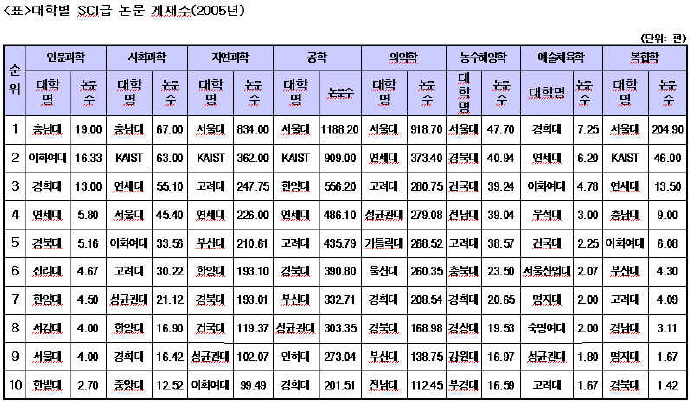 ±×·¯³ª ±³¿ø 1ÀÎ´ç ³í¹® ¼ö´Â KAIST°¡ 9.04ÆíÀ¸·Î 1À§¸¦ Â÷ÁöÇß´Ù. ¼¿ï´ë(3.75Æí) ÇѾç´ë(3.66Æí) Ãæ³²´ë(3.21Æí) °æºÏ´ë(2.23Æí)°¡ 2~5À§¸¦ ±â·ÏÇß´Ù. ¹Ý¸é, ±³¿ø 1Àδç SCI±Þ ³í¹® ¼ö´Â KAIST(3.44Æí) ±¤ÁÖ°úÇбâ¼ú¿ø(2.23Æí) ¼¿ï´ë(1.80Æí) Çѱ¹Á¤º¸Åë½Å´ë(1.28Æí) Æ÷½ºÅØ(1.12Æí) ¼øÀ¸·Î Á¶»çµÆ´Ù.