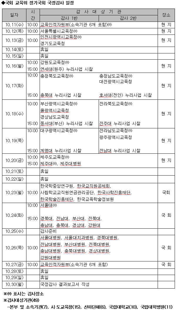 ¼¿ï´ë µî 9°³ ±¹¸³´ë¿¡ ´ëÇÑ °¨»ç´Â 24ÀÏ, ¼¿ï´ëº´¿ø µî 10°³ ±¹¸³´ë º´¿ø¿¡ ´ëÇÑ °¨»ç´Â 26ÀÏ °¢°¢ ±¹È¸¼ ½Ç½ÃÇÑ´Ù. ±×·¯³ª Á¦ÁÖ´ë¿Í Á¦Áִ뺴¿øÀº Á¦ÁÖµµ±³À°Ã»°ú ÇÔ²² ³»´Þ 20ÀÏ ÇöÁö¿¡¼ ½Ç½ÃŰ·Î Çß´Ù.