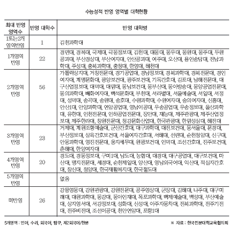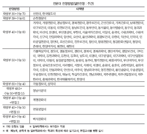 Àû½ÊÀÚ°£È£´ë´Â ¿Ü±¹¾î¿¡ °¡ÁßÄ¡¸¦ 50% ÁÖ°í ½Å¼º´ëÇÐÀº °£È£°ú, ¹°¸®Ä¡·á°ú, Ä¡À§»ý°ú¿¡¼ ÃÖ¿ì¼ö 2°³ ¿µ¿ªÀ» ÇÕÇØ 6µî±Þ À̳»ÀÎ ÃÖÀúÇзÂÀ» Àû¿ëÇÑ´Ù. ¶Ç ³²ÇØÀü¹®´ë, ¼¿ï¿¹¼ú´ë, ¿ì¼Û°ø¾÷´ë,â¿øÀü¹®´ë µî 20°÷Àº 2006Çг⵵ ¼ö´É Á¡¼ö¸¦ Ȱ¿ëÇÑ´Ù.