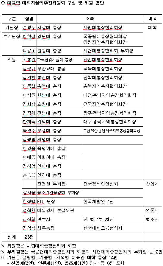 ÀÚÀ²ÈÃßÁøÀ§¿¡´Â ´ë±³Çù »êÇÏ ¼³¸³º°, ±â´Éº°, Áö¿ªº° ÇùÀÇü ´ëÇ¥ µî ´ëÇÐ ÃÑÀå 14¸í°ú »ê¾÷°è, ¾ð·Ð°è, ¹ýÁ¶°è ÀÎ»ç µî 23¸íÀÌ Âü¿©Çϸç À§¿øÀåÀº »ç¸³´ë ÃÑÀåÇùÀÇȸÀåÀÎ ¼Õº´µÎ ¼°´ë ÃÑÀåÀÌ ¸Ã¾Ò´Ù.