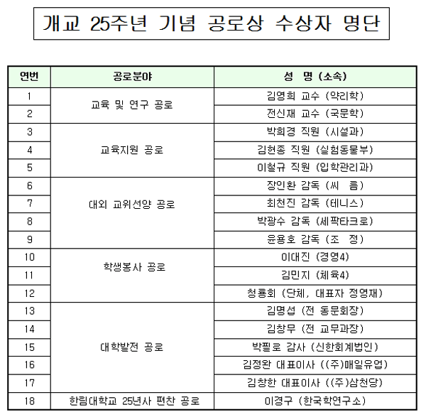 ½Ã»óÀº ¡ã±³À° ¹× ¿¬±¸ ¡ã´ëÇйßÀü ¡ã±³À°Áö¿ø ¡ã´ë¿Ü ±³À§¼±¾ç ¡ãÇлýºÀ»ç ¡ã¡ºÇѸ²´ëÇб³ 25³â»ç¡» ÆíÂù °ø·ÎÀÚ¿¡ ´ëÇØ ÀÌ·ïÁ³´Ù. ¡®±³À° ¹× ¿¬±¸ °ø·Î¡¯ ºÎ¹®ÀÇ ±è¿µÈñ ±³¼ö(¾à¸®ÇÐ), Àü½ÅÀç ±³¼ö(±¹¹®ÇÐ)¸¦ ºñ·ÔÇØ ±èÁ¤¿Ï (ÁÖ)¸ÅÀÏÀ¯¾÷ ´ëÇ¥ÀÌ»ç, ±èâÇÑ (ÁÖ)»ïõ´ç ´ëÇ¥ÀÌ»ç µîÀÌ ¡®´ëÇйßÀü °ø·Î¡¯ ºÎ¹® »óÀ» ¼ö»óÇß´Ù.