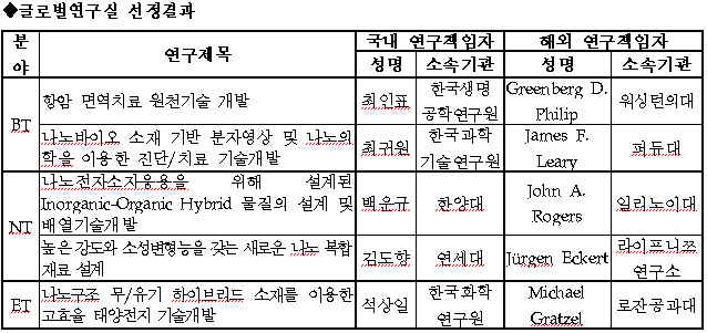 BTºÐ¾ß¿¡¼´Â Çѱ¹»ý¸í°øÇבּ¸¿ø-¿ö½ÌÅÏÀÇ´ë(Ç×¾Ï ¸é¿ªÄ¡·á ¿øÃµ±â¼ú °³¹ß)¿Í Çѱ¹°úÇбâ¼ú¿¬±¸¿ø-¹Ì±¹ ÆÛµà´ë(³ª³ëÀÇÇÐÀ» ÀÌ¿ëÇÑ Áø´Ü¡¤Ä¡·á ±â¼ú°³¹ß)ÀÌ, ETºÐ¾ß¿¡¼´Â Çѱ¹ÈÇבּ¸¿ø-½ºÀ§½º ·ÎÀܰø´ë(°íÈ¿À² žçÀüÁö ±â¼ú°³¹ß)ÀÌ °¢°¢ ±Û·Î¹ú¿¬±¸½Ç·Î ¼±Á¤µÆ´Ù.