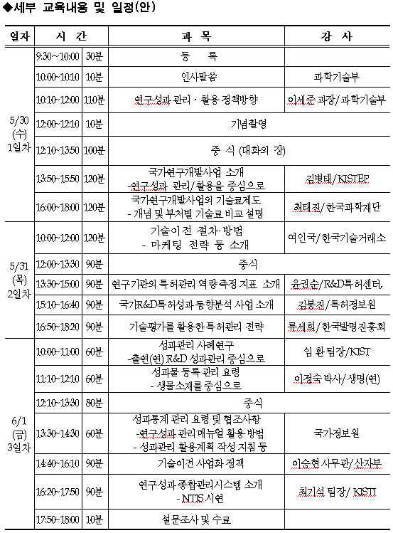 R&D¼º°ú°ü¸® Ȱ¿ë°úÁ¤ÀÎ À̹ø ±³À°¿¡¼´Â ¸¶ÄÉÆÃ Àü·« µî ±â¼úÀÌÀü ÀýÂ÷¿Í ¹æ¹ý, ±â¼úÆò°¡¸¦ ÅëÇÑ Æ¯Çã°ü¸® Àü·«, Á¤ºÎÀÇ ±â¼úÀÌÀü »ç¾÷È Á¤Ã¥ µî ±â¼ú°ü¸® ¹æ¾È°ú ¿¬±¸¼º°ú Á¾ÇÕ°ü¸®½Ã½ºÅÛ ¼Ò°³, ¼º°ú°ü¸® »ç·Ê¿¬±¸ µîÀÇ ¼º°ú°ü¸® ¹æ¾ÈÀ» ÁýÁß ±³À°ÇÑ´Ù.