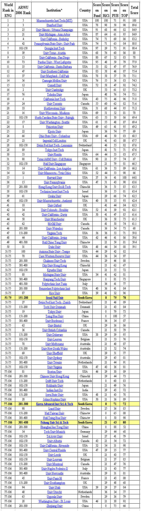 <Ç¥> ¼¼°è ´ëÇÐ ¼øÀ§ - °øÇÐ