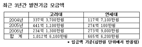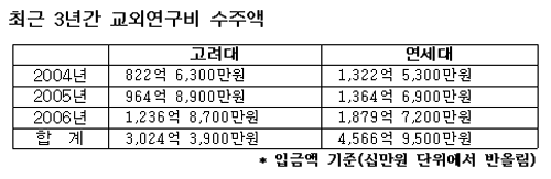 º»Áö°¡ 23ÀÏ ¾ç±³ÀÇ ÃÖ±Ù 3³â°£(2004³â~2006³â) ±â±Ý Á¶¼º ÇöȲÀ» ºÐ¼®ÇÑ °á°ú ¿¬¼¼´ë´Â ±³¿Ü¿¬±¸ºñ ¼öÁÖ¿¡¼, °í·Á´ë´Â ¹ßÀü±â±Ý ¸ð±Ý¿¡¼ ¿ìÀ§¸¦ ³ªÅ¸³Â´Ù. ¿¬¼¼´ë´Â ÃÖ±Ù 3³â°£ 4,566¿©¾ï¿øÀ», °í·Á´ë´Â 3,024¿©¾ï¿øÀ» ±³¿Ü¿¬±¸ºñ·Î ¼öÁÖÇß´Ù. ¹Ý¸é °°Àº ±â°£ ¹ßÀü±â±ÝÀº °í·Á´ë°¡ 1,012¿©¾ï¿øÀ», ¿¬¼¼´ë°¡ 665¿©¾ï¿øÀ» ¸ð±ÝÇÑ °ÍÀ¸·Î ³ªÅ¸³µ´Ù. ±³¿Ü¿¬±¸ºñ¿Í ¹ßÀü±â±ÝÀ» ÇÕ»êÇÑ ÃѾ׿¡¼´Â ¿¬¼¼´ë°¡ 5,233¿©¾ï¿øÀ¸·Î 4,037¿©¾ï¿øÀÇ °í·Á´ë¿¡ ¾Õ¼± °ÍÀ¸·Î Áý°èµÆ´Ù.