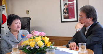 | ¡ã º»Áö ÀÌÀοø ȸÀå(¿À¸¥ÂÊ)°ú ´ë´ãÇϰí ÀÖ´Â ÁöÀºÈñ ÃÑÀå. |