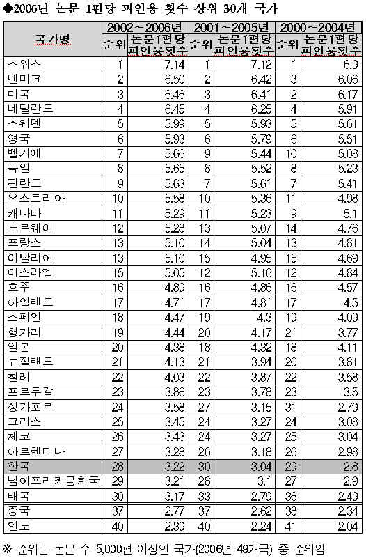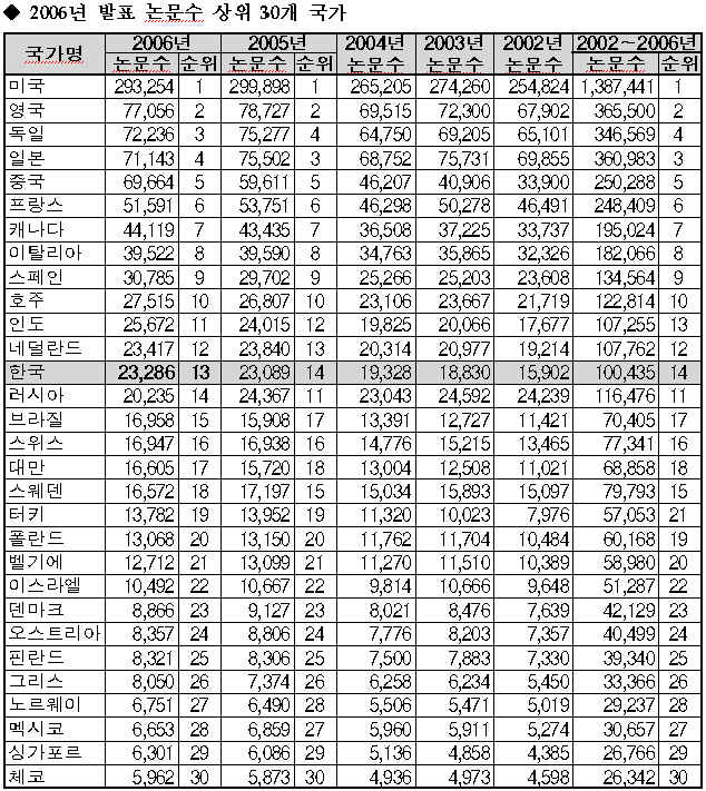 ¿ì¸®³ª¶ó´Â Àü³âº¸´Ù ÇÑ ´Ü°è ¼øÀ§°¡ »ó½ÂÇßÀ» »Ó ¾Æ´Ï¶ó 5³â ¸¸¿¡ ¡®¸¶ÀÇ 14À§¡¯¸¦ ¹þ¾î³µ´Ù. ¿ì¸®³ª¶ó´Â °úÇбâ¼ú ³í¹® ¼ö ¼øÀ§°¡ Áö³ 2000³â 16À§¿¡¼ 2001³â 15À§, 2002³â 14À§·Î ÇØ¸¶´Ù »ó½ÂÇßÁö¸¸ 2002³â ÀÌÈÄ 4³â ¿¬¼Ó 14À§¿¡ ¸Ó¹°·¶´Ù.