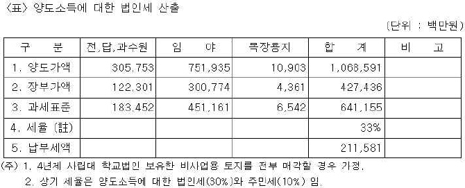ÇöÇà ¹ýÀμ¼¹ý¿¡ µû¸£¸é Çб³¹ýÀÎÀÌ ºñ»ç¾÷¿ë ÅäÁö µî ¼öÀÍ¿ë ±âº»Àç»êÀ» óºÐÇÒ °æ¿ì ¹ýÀμ¼ ¹× Áֹμ¼ 27.5%¿Í´Â º°µµ·Î ¾çµµ¼ÒµæÀÇ 33%¸¦ ¹ýÀμ¼ ¹× Áֹμ¼·Î ³»¾ß ÇÑ´Ù. 5³â À̳»¿¡ °íÀ¯¸ñÀû¿¡ »ç¿ëÇÏ¸é ±âÁ¸ ¹ýÀμ¼ ³³ºÎ°¡ À¯¿¹µÇ±ä ÇÏÁö¸¸ °æ¿ì¿¡ µû¶ó¼± ¾çµµÂ÷ÀÍÀÇ ÃÖ´ë 60.5%¸¦ ¹ýÀμ¼·Î ³³ºÎÇØ¾ß ÇÏ´Â °Í.